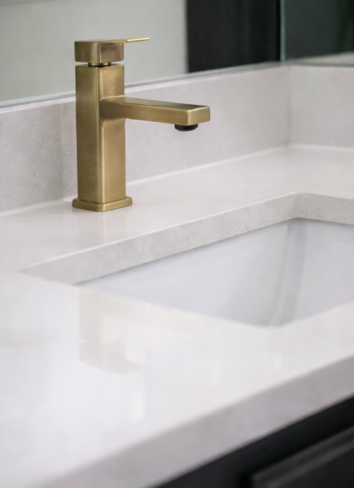 This quartz countertop stands out for its clean, seamless design and everyday durability. The smooth, non-porous surface is easy to maintain while providing a sleek, functional workspace around the sink, making it a practical choice for daily use.